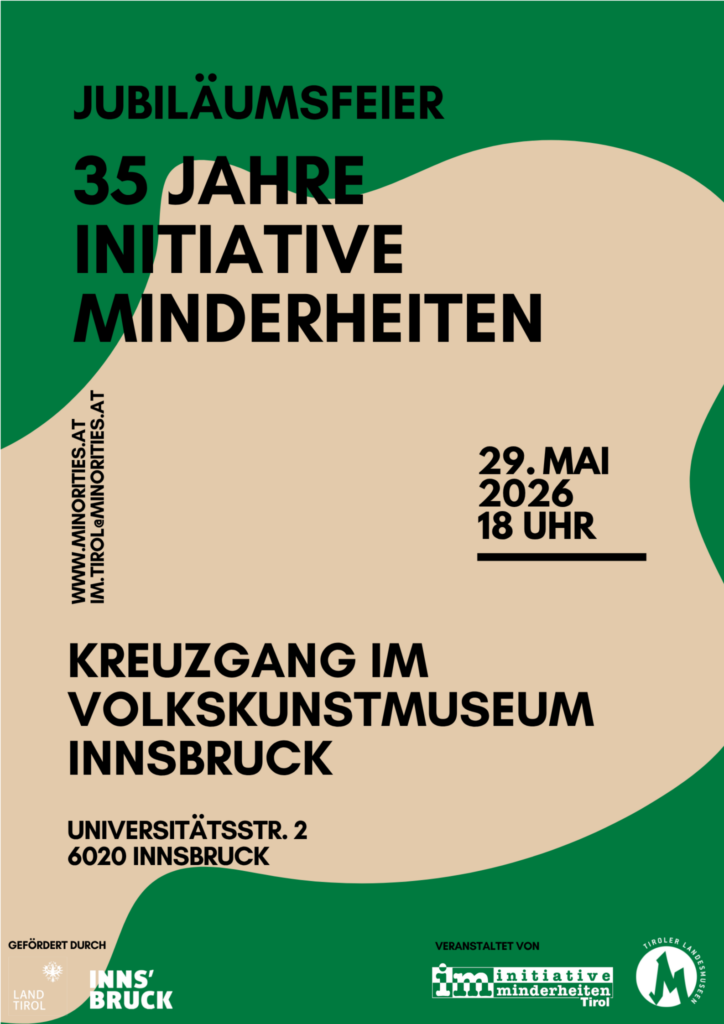Seit 35 Jahren steht die Initiative Minderheiten für die Sichtbarmachung, gegenseitige Stärkung und das Empowerment von Minderheiten. Wegbegleiter*innen präsentieren in einem kurzweiligen Programm ihre Geschenke in Form von Geschichten, Musik, Lyrik etc. und in der Ausstellung „Was wir fordern -Minderheitenbewegungen in Österreich“ werden die Vielfalt minoritärer Bewegungen und die gesamtgesellschaftliche Bedeutung ihrer Forderungen sichtbar. Deshalb lade wir euch herzlich ein am 29.05.2026, ab 18 Uhr im Kreuzgang des Volkskunstmuseums mit uns gemeinsam zu feiern.