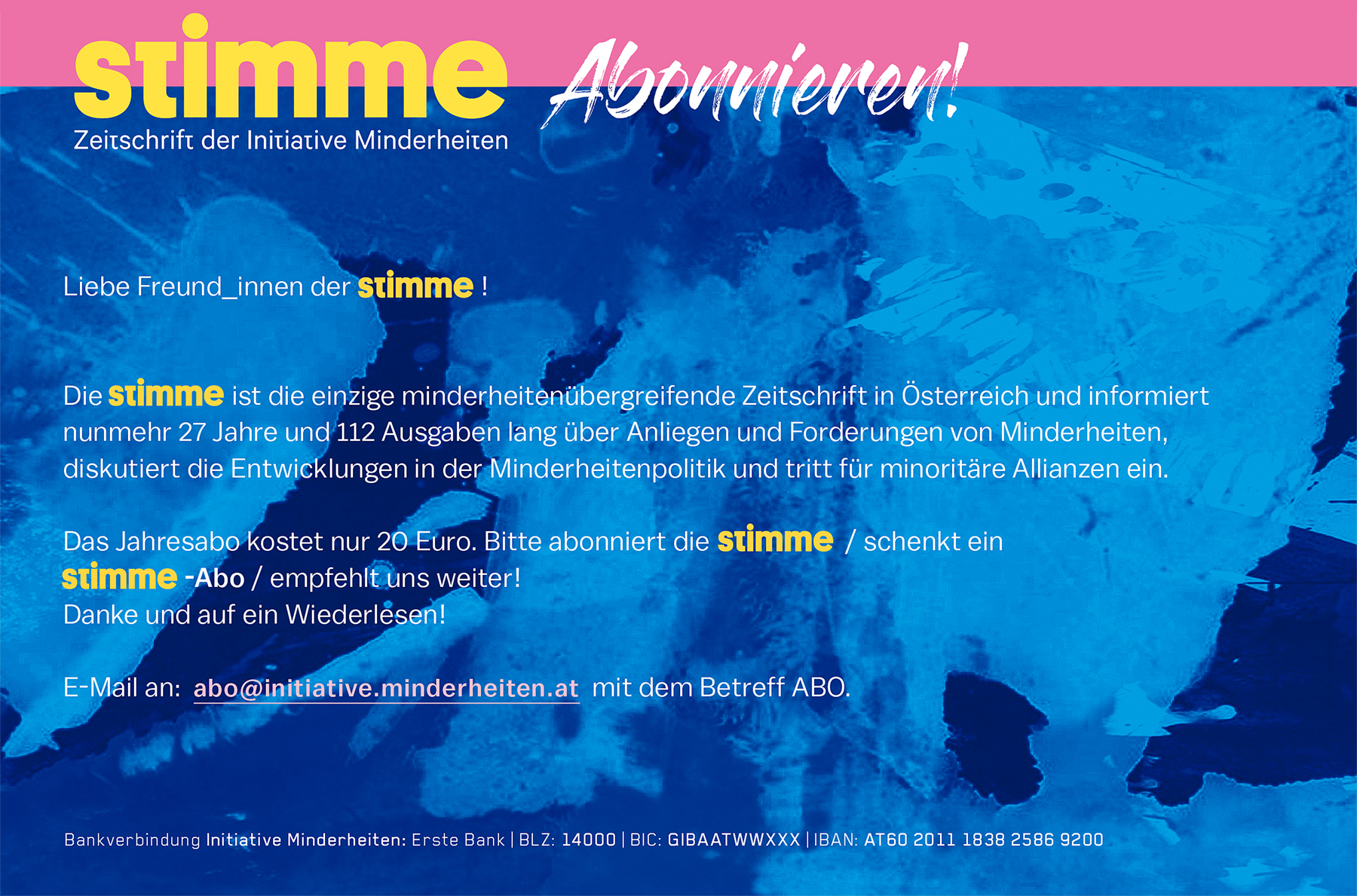 Stimme – Zeitschrift der Initiative Minderheiten Jahresabo: € 20,- // Zwei-Jahresabo: € 38,- Abo International: € 30,- // Zwei-Jahresabo International: € 58,- (Für Vereinsmitglieder kostenlos, Mitgliedschaft jährlich € 25,-) Sie erreichen unser Aboservice unter: Ebru Uzun – abo(at)initiative.minderheiten.at sowie telefonisch…